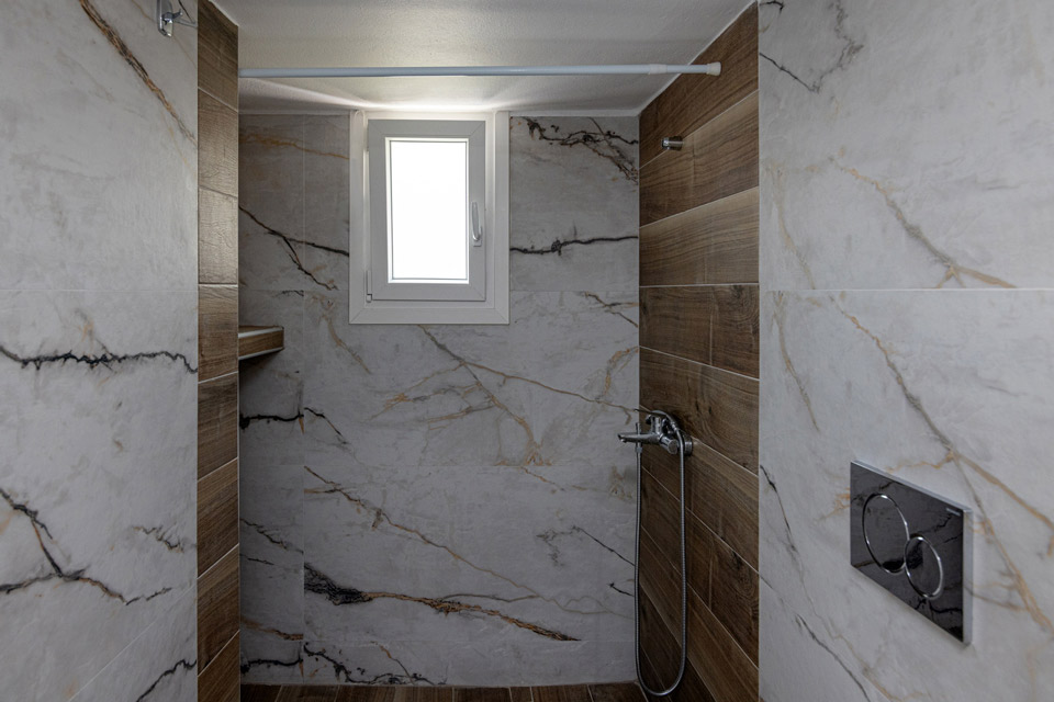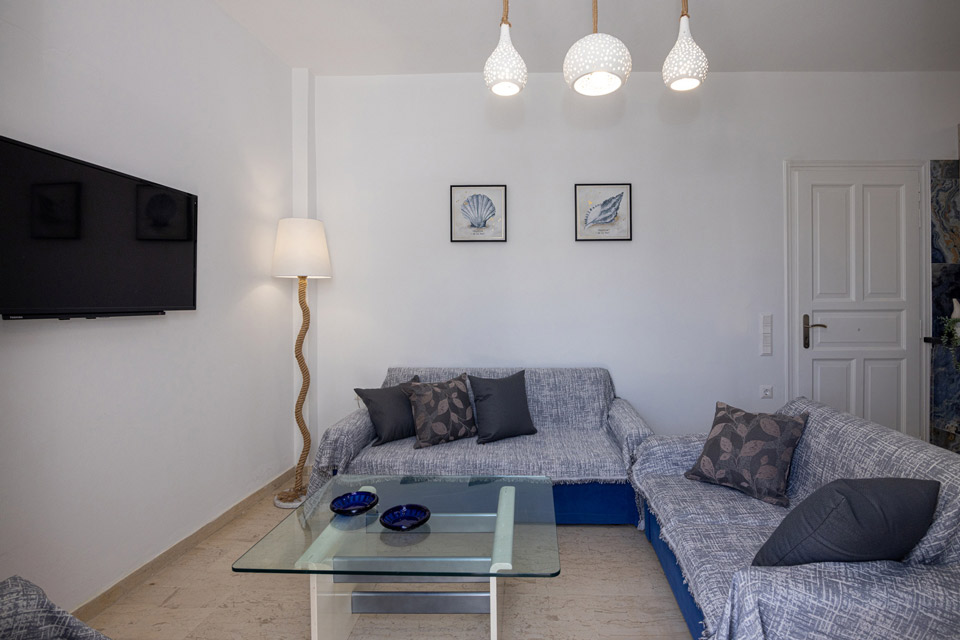 It has 2 bedrooms with a double bed, air conditioning and TV in the first, and two singles in the second with air conditioning.