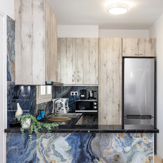 The kitchen is fully equipped and there is a TV and air conditioning in the room.